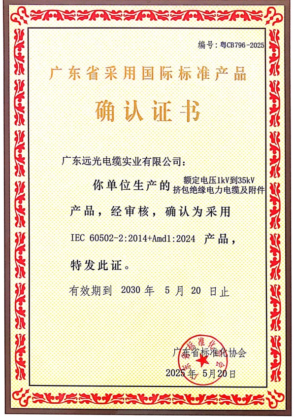2025年5月,遠光電纜核心產品額定電壓1kV到35kV擠包絕緣電力電纜、額定電壓450/750V及以下聚氯乙烯絕緣電纜、圓線同心絞架空絞線三大系列產品,分別對應IEC 60502(電力電纜)、IEC 60227(聚氯乙烯電線)、IEC 61089(架空絞線)等國際標準,經廣東省標準化協會評審,正式獲得采用國際標準產品確認證書。