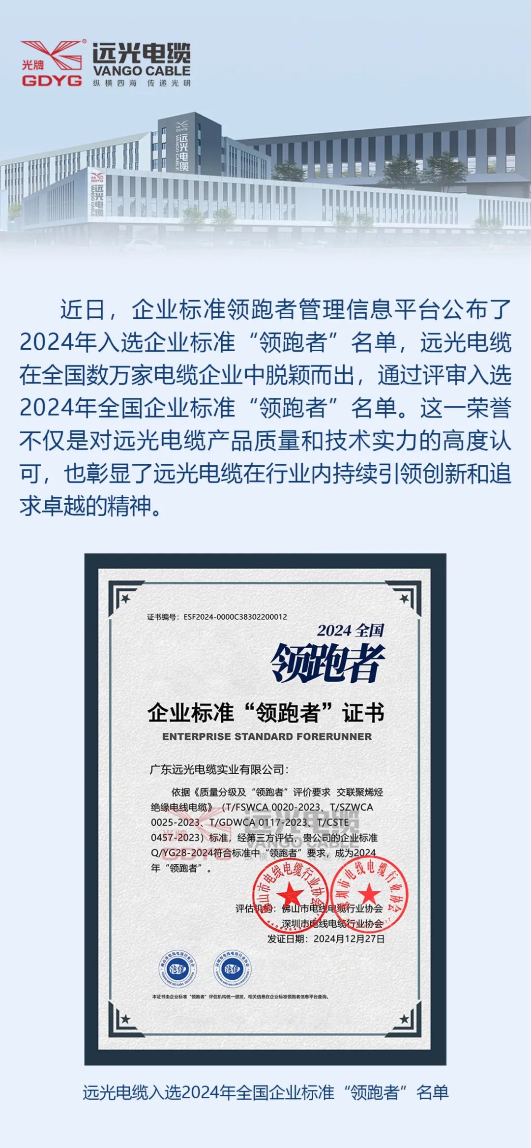 喜訊|遠光電纜入選2024年企業標準“領跑者”名單