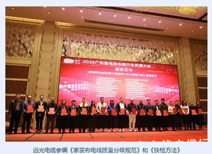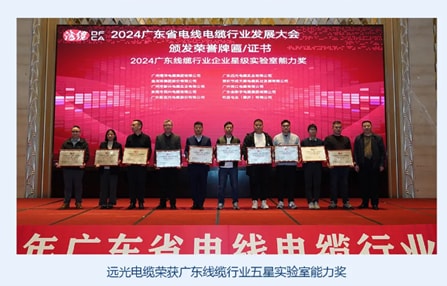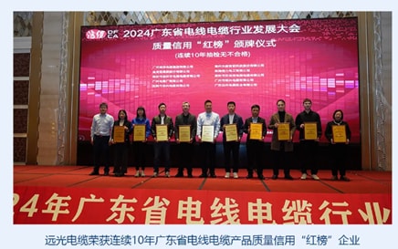 在廣東省乃至全國的線纜行業中,遠光電纜憑借其卓越的產品質量和踏實的技術研發,斬獲了眾多令人矚目的榮譽獎項,在行業內樹立了光輝的典范。2024年12月26日,2024年廣東省電線電纜行業發展大會在廣州召開,遠光電纜榮獲多項榮譽包括廣東省電線電纜產品質量信用“紅榜”企業(連續10年(2015-2024年)電線電纜產品質量抽檢合格)、“廣東線纜產業最具競爭力企業20強”稱號、廣東線纜行業五星實驗室等。這些榮譽的獲得是對遠光電纜多年來在線纜領域深耕細作的充分肯定。